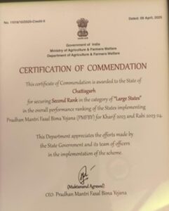 प्रधानमंत्री फसल बीमा योजना में छत्तीसगढ़ को राष्ट्रीय स्तर पर बड़ी उपलब्धि।