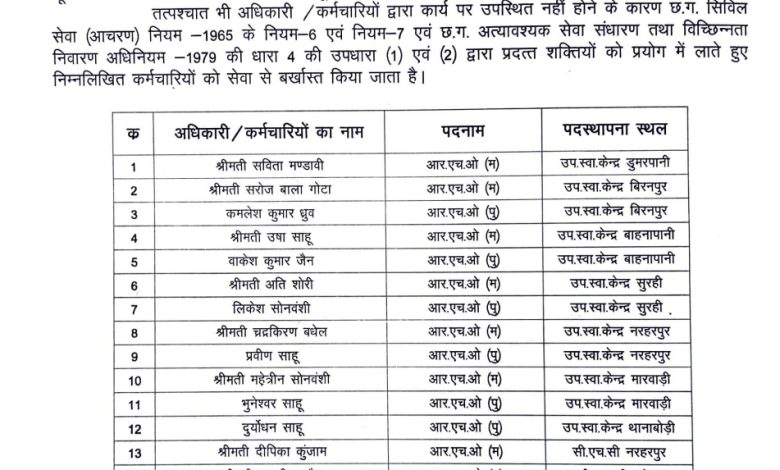 जिले के स्वास्थ्य विभाग में कार्यरत कर्मचारियों द्वारा अपनी मांगों के संबंध में अनाधिकृत रूप से निरंतर दिनांक 21.08.2023 से हड़ताल में है जिसके कारण से लोक हित / नागरिक सेवायें तथा शासकीय कार्य प्रभावित हो रही है व लोगों को असुविधा हो रही है। जिन सेवाओं के विषय में एस्मा छ.ग. अत्यावश्यक सेवा संधारण तथा विच्छिन्नता निवारण अधिनियम 1979 की धारा 4 की उप धारा (1) एवं ( 2 ) द्वारा प्रदत्त शक्तियों को प्रयोग में लाते हुए एवं सूचना उपरांत भी कर्मचारियों द्वारा अपने कार्यों में उपस्थित नहीं होने पर एस्मा अंतर्गत कार्यवाही किये जाने हेतु कार्यालयीन प्रथम सूचना पत्र दिनांक 25.08.2023 एवं अंतिम सूचना पत्र दिनांक 28.08.2023 के माध्यम से सूचित किया गया है। तत्पश्चात भी अधिकारी / कर्मचारियों द्वारा कार्य पर उपस्थित नहीं होने के कारण छ.ग. सिविल सेवा (आचरण) नियम 1965 के नियम-6 एवं नियम – 7 एवं छ.ग. अत्यावश्यक सेवा संधारण तथा विच्छिन्नता निवारण अधिनियम 1979 की धारा 4 की उपधारा (1) एवं ( 2 ) द्वारा प्रदत्त शक्तियों को प्रयोग में लाते हुए निम्नलिखित कर्मचारियों को सेवा से बर्खास्त किया जाता है जिसके आदेश जारी किए गए ।