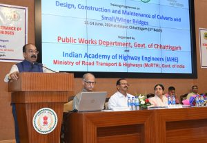 राज्य शासन के लोक निर्माण विभाग और केन्द्रीय सड़क परिवहन एवं राजमार्ग मंत्रालय के भारतीय राजमार्ग अभियंता अकादमी (IAHE – Indian Academy of Highway Engineers) द्वारा रायपुर के नवीन विश्राम भवन में लोक निर्माण विभाग के रायपुर और दुर्ग संभाग के अभियंताओं के लिए इस चार दिवसीय प्रशिक्षण का आयोजन किया गया है। इसमें दोनों संभागों के विभागीय उप अभियंताओं, सहायक अभियंताओं, कार्यपालन अभियंताओं और अधीक्षण अभियंताओं को पुलिया तथा लघु एवं मध्यम पुलों की डिजाइन, निर्माण, रखरखाव और मरम्मत के साथ ही गुणवत्ता नियंत्रण की बारीकियों की जानकारी दी जा रही है। विभिन्न संस्थाओं और निर्माण एजेंसियों के विषय विशेषज्ञ उन्हें इनका प्रशिक्षण दे रहे हैं।
