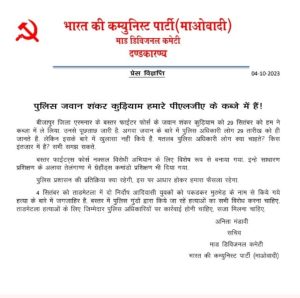 नक्सलियों के कब्जे में है लापता जवान शंकर, माओवादियों ने प्रेस नोट जारी कर पुलिस पर लगाए गंभीर आरोप, कहा- 29 सितंबर से है कब्जे में …