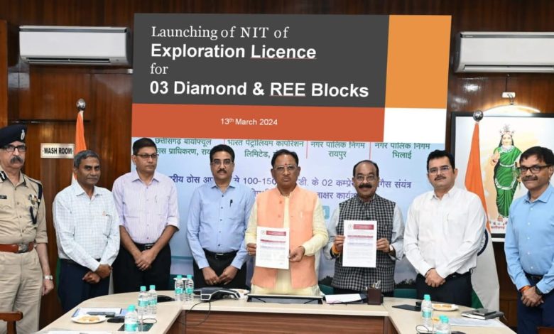 मुख्यमंत्री श्री विष्णुदेव साय द्वारा आज मुख्यमंत्री निवास में आयोजित एक संक्षिप्त समारोह में कोंडागांव, नारायणपुर और बस्तर जिले में डायमंड तथा सामरिक महत्व के रेयर अर्थ खनिज के तीन ब्लॉक का ई-नीलामी के माध्यम से एक्सप्लोरेशन लाइसेंस आबंटन के लिए एनआईटी (नोटिस इनवाइटिंग टेंडर) जारी किया गया। कार्यक्रम में उप मुख्यमंत्री श्री अरूण साव, खनिज विभाग के सचिव श्री पी दयानंद, संचालक भौमिकी एवं खनिकर्म श्री सुनील जैन सहित संबंधित अधिकारी इस अवसर पर उपस्थित थे।