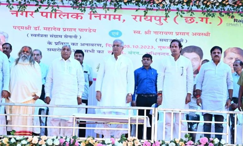 शासकीय स्वर्गीय नारायण प्रसाद अवस्थी आयुर्वेदिक महाविद्यालय में स्वतंत्रता संग्राम सेनानी और पद्मश्री स्वर्गीय डॉ. महादेव प्रसाद पांडेय और समाजसेवी स्वर्गीय श्री नारायण प्रसाद अवस्थी की प्रतिमा अनावरण के कार्यक्रम में पहुँचे मुख्यमंत्री श्री भूपेश बघेल