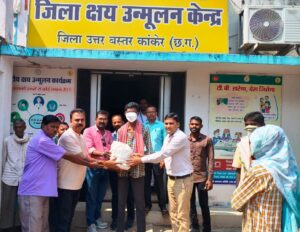 उत्तर बस्तर कांकेर . कलेक्टर श्री नीलेश कुमार महादेव क्षीरसागर के निर्देशानुसार एवं मुख्य चिकित्सा एवं स्वास्थ्य अधिकारी डॉ. महेश शांडिया के मार्गदर्शन में जिले में प्रधानमंत्री टी.बी. मुक्त भारत अभियान चलाया जा रहा है। उक्त अभियान को समाजसेवी संस्थानों व संगठनों से भी भरपूर समर्थन और व्यापक सहयोग मिल रहा है। इसी क्रम में आज कार्यालय जिला क्षय उन्मूलन केंद्र में नगर की समाजसेवी संस्था ‘‘जनसहयोग’’ के द्वारा 15 मरीजों को गोद लेकर उन्हें पौष्टिक आहार प्रदान किया गया। संस्था के संचालक श्री पप्पू मोटवानी गोद ने लिए गए सभी मरीजों का स्वास्थ्य संबंधी हाल-चाल पूछकर जल्द सेहतमंद होने हेतु शुभकामनाएं भी दी।