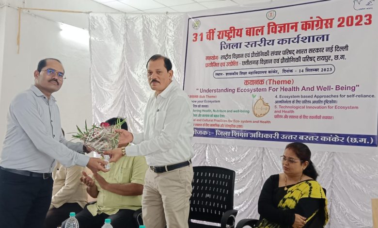 कांकेर –राष्ट्रीय बाल विज्ञान कांग्रेस 2023 जिला स्तरीय कार्यशाला आयोजन शासकीय शिक्षा महाविद्यालय में जिला शिक्षा अधिकारी भुवन जैन के आतिथ्य में किया गया। जिला समन्वय पवन कुमार सेन ने बताया कि छत्तीसगढ़ विज्ञान एवं प्रौद्योगिकी परिषद के दिशा निर्देश पर कथानक स्वास्थ्य और कल्याण के लिए पारितंत्र को समझना पर आधारित पांच उपकथानक विषय में कार्यशाला केंद्रित रहा। कार्यशाला के मुख्य अतिथि जिला शिक्षा अधिकारी भुवन जैन एवं विशेष अतिथि प्राचार्य डॉ पूर्वा शर्मा शासकीय शिक्षा महाविद्यालय रही। कार्यशाला का उद्देश्य बच्चों में प्राकृतिक नैसर्गिक जिज्ञासा एवं सृजनात्मकता विकसित करने हेतु मंच प्रदान करना है एवं 10 वर्ष से 17 वर्ष के बच्चों को राष्ट्र के भविष्य के प्रति सार्थक सपना संजोने व उन्हें साकार करने के लिए प्रोत्साहित कर एक ऐसी पीढ़ी का निर्माण करने से है जो समाज और राष्ट्र के प्रति संवेदनशील एवं उत्तरदायित्व हो सके। इस कार्यशाला में जिले के हायर सेकेंडरी, हाई स्कूल, माध्यमिक विद्यालयों से कुल 95 विज्ञान शिक्षक ने भागीदारी की। कार्यशाला में उपस्थित शिक्षकों को संबोधित करते हुए जिला शिक्षा अधिकारी भुवन जैन ने कहा कि बच्चों की प्रतिभाओं को निखारने में विज्ञान शिक्षकों की अहम भूमिका होती है। आप सभी शिक्षक कार्यशाला में प्रशिक्षण प्राप्त कर बच्चों में विज्ञान के प्रति जिज्ञासा उत्पन्न कर समाज और राष्ट्र की प्रति संवेदनशील बनाएं। कार्यशाला में उपस्थित विषय विशेषज्ञ व्याख्याता राजेश सिंह देव ने संबोधित करते हुए कहा कि बच्चों में वैज्ञानिक चेतना विकसित करने का राष्ट्रीय बाल विज्ञान कांग्रेस सशक्त माध्यम है। इससे नई आविष्कार को दिशा मिलेगी। विषय विशेषज्ञ व्याख्याता मो असलम एवं हेमलता मंडावी ने अपने उद्बोधन में जानकारी दी कि हम अपने पारिस्थितिक तंत्र को किस प्रकार रिस्टोर कर सकते हैं। इसके लिए बच्चों में जन जागरूकता लाना अत्यंत आवश्यक है ताकि वह भविष्य में संवेदनशील होकर स्थानीय परीवेश में वैज्ञानिक विधि से समस्याओं का समाधान निकाल सके। विषय विशेषज्ञों ने सभी थीम पर प्रोजेक्ट आईडिया, लॉग बुक, सर्वे रिपोर्ट, चार्ट तथा प्रोजेक्ट के विभिन्न बिंदुओं पर बारीकी से जानकारी प्रदान किया।