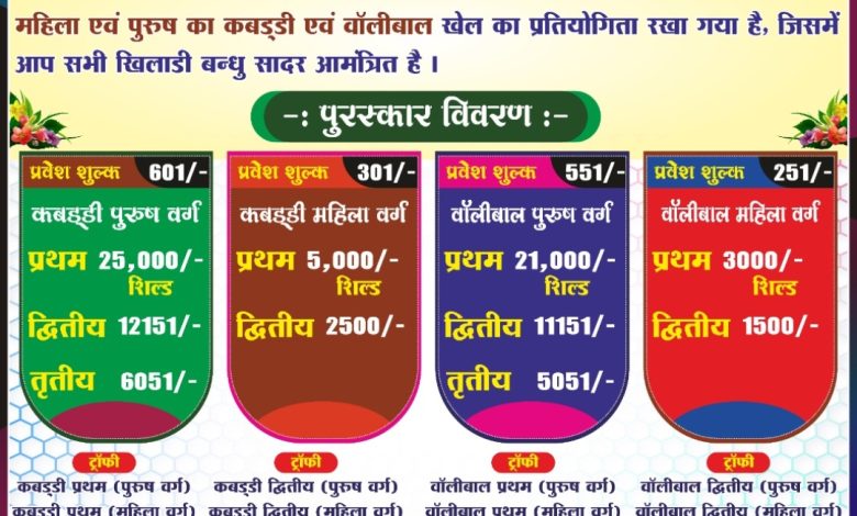कोयलीबेड़ा। 16 अक्टूबर से पँचायत स्तरीय कबड्डी और बॉलीबाल प्रतियोगिता का आयोजन चारगांव पँचायत के आश्रित ग्राम बिलाईकछार में होगी, जिसमे महिला व पुरुष दोनों ही वर्ग में ग्रामीण खिलाड़ी अपना दमखम दिखाएंगे। चारगांव सरपँच व आयोजन मण्डल के संरक्षक सुखीराम उसेण्डी ने बताया कि नवरात्रि, दशहरा एवं दीपावली के उपलक्ष्य में दो दिवसीय ग्रामीण महिला एवं पुरुष दोनों की वर्ग का कबड्डी एवं बॉलीबाल खेल प्रतियोगिता आयोजित की जा रही है। इसमें दोनों ही वर्ग के लिए अलग अलग प्रवेश शुल्क व इनामी राशि के साथ ही शील्ड प्रदान की जाएगी। पुरूष वर्ग के कबड्डी के लिए प्रवेश शुल्क 601 रुपये तो बॉलीबाल के लिए 551 रुपये रखी गयी है, वही महिला वर्ग के कबड्डी के लिए प्रवेश शुल्क 301 तो बॉलीबाल के लिए 251 रुपये रखी गयी है। टीम पँचायत स्तर की ही इस प्रतियोगिता में भाग ले पाएंगे जो एक ही पँचायत के सभी खिलाड़ी होंगे। बात अगर पुरस्कार राशि की करें तो पुरूष वर्ग कबड्डी में प्रथम पुरस्कार 25000 रुपये व शील्ड प्रदान किया जाएगा, द्वितीय स्थान के लिए 12151 रुपये नकद व तृतीय स्थान पर आने वाली टीम को 6051 रुपये दिए जाएंगे।